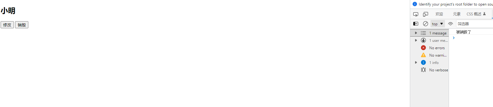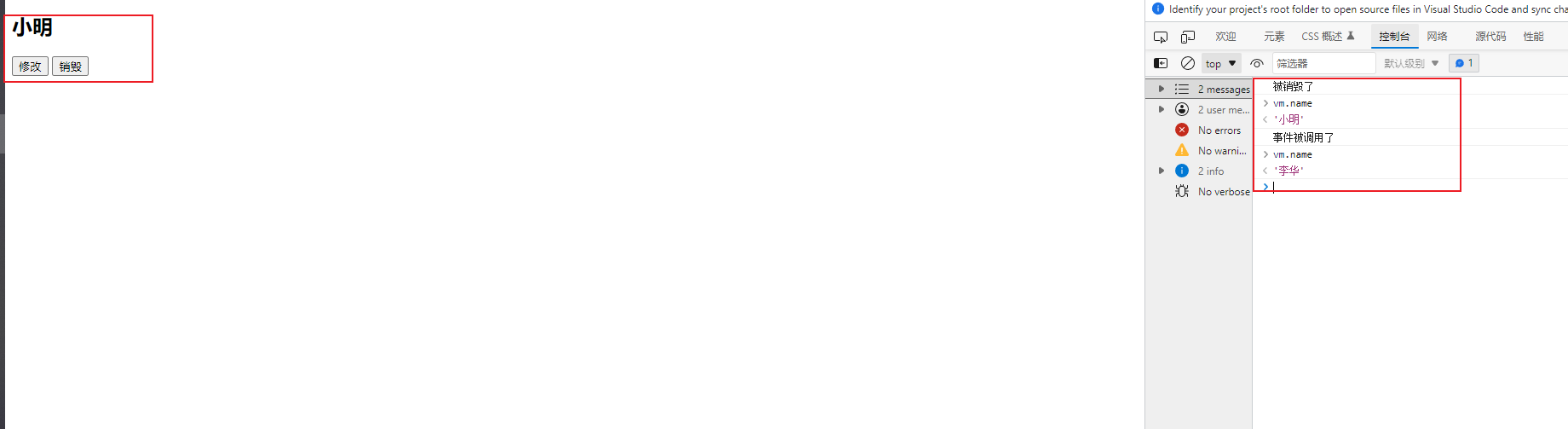 点击销毁,然后查看 vm.name 是‘小明’,然后调用修改函数,再次查看 vm.name 是‘李华’,但是页面数据并没有发生变化。
