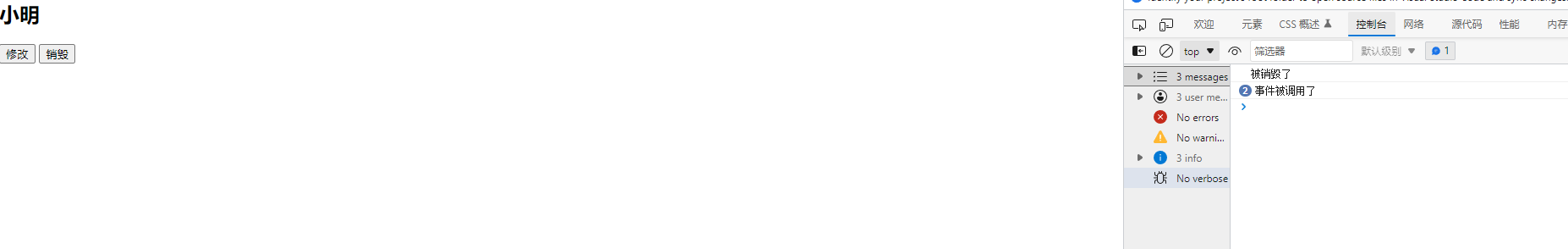点击销毁,之后点击修改,发生修改的事件可以一直被调用,但是页面不发生变化。vm.$destroy 解绑的是自定义事件。完全销毁一个实例。清理它与其它实例的连接,解绑它的全部指令及事件监听器。