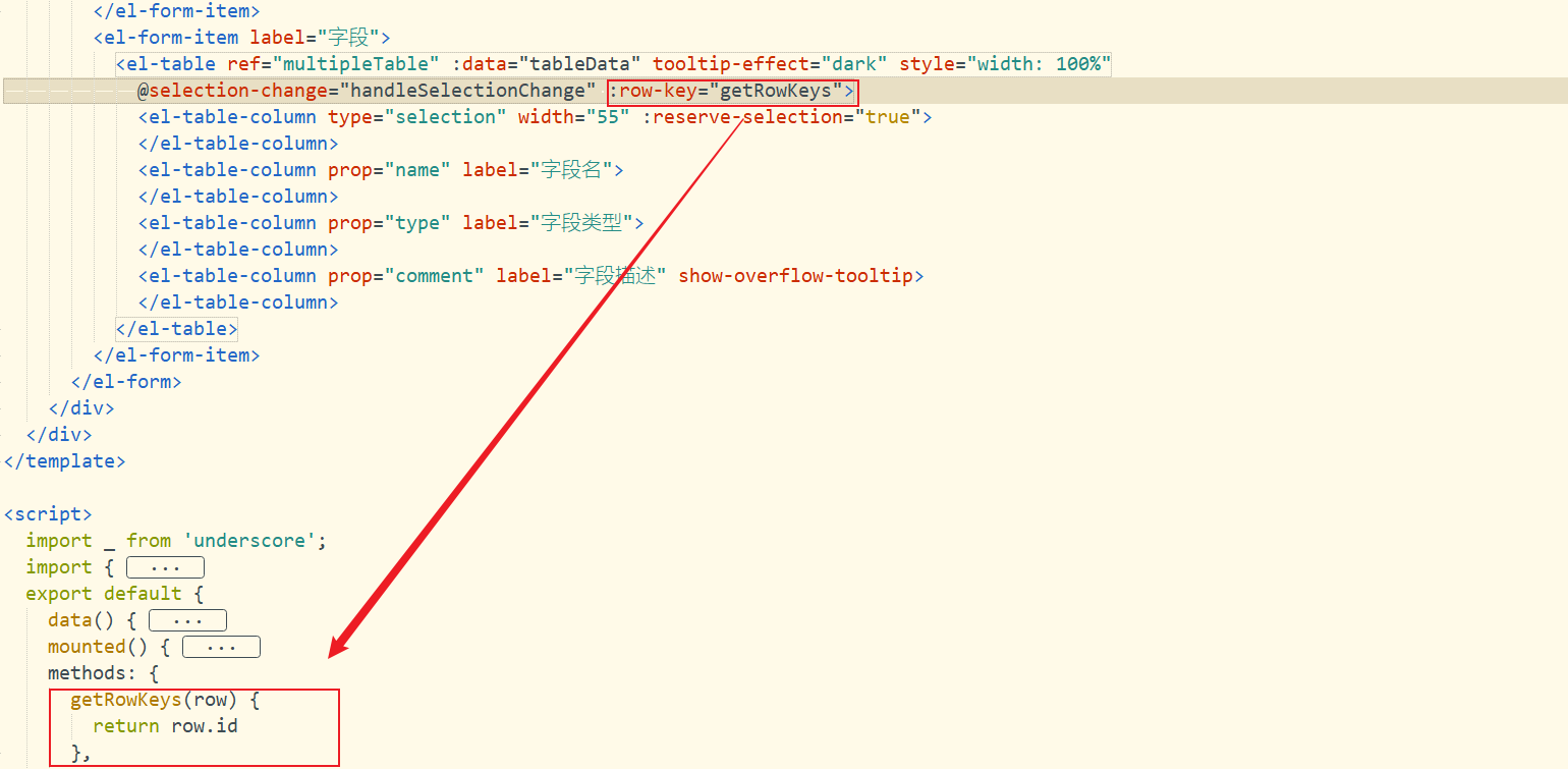 @selection-change="handleSelectionChange" :row-key="getRowKeys"> | |